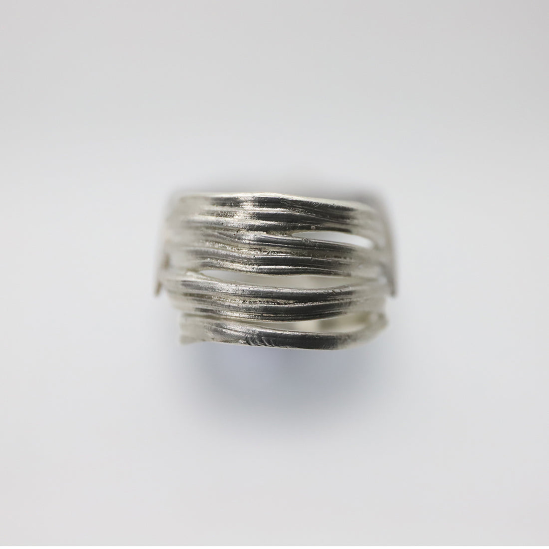 DESCRIPTION Soft Armor wraps the finger in layered bands of silver — textured like woven...